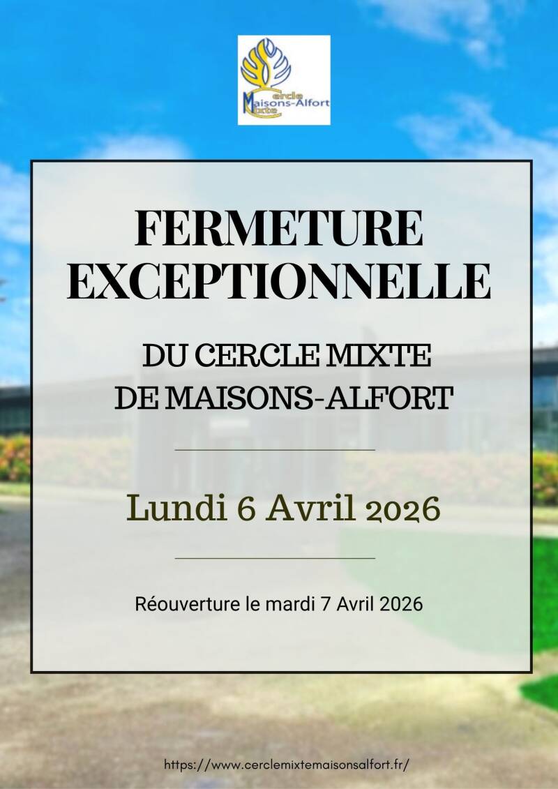 La brasserie du Cercle Mixte de Maisons-Alfort sera exceptionnellement fermée du 20 avril au 1er mai 2026.